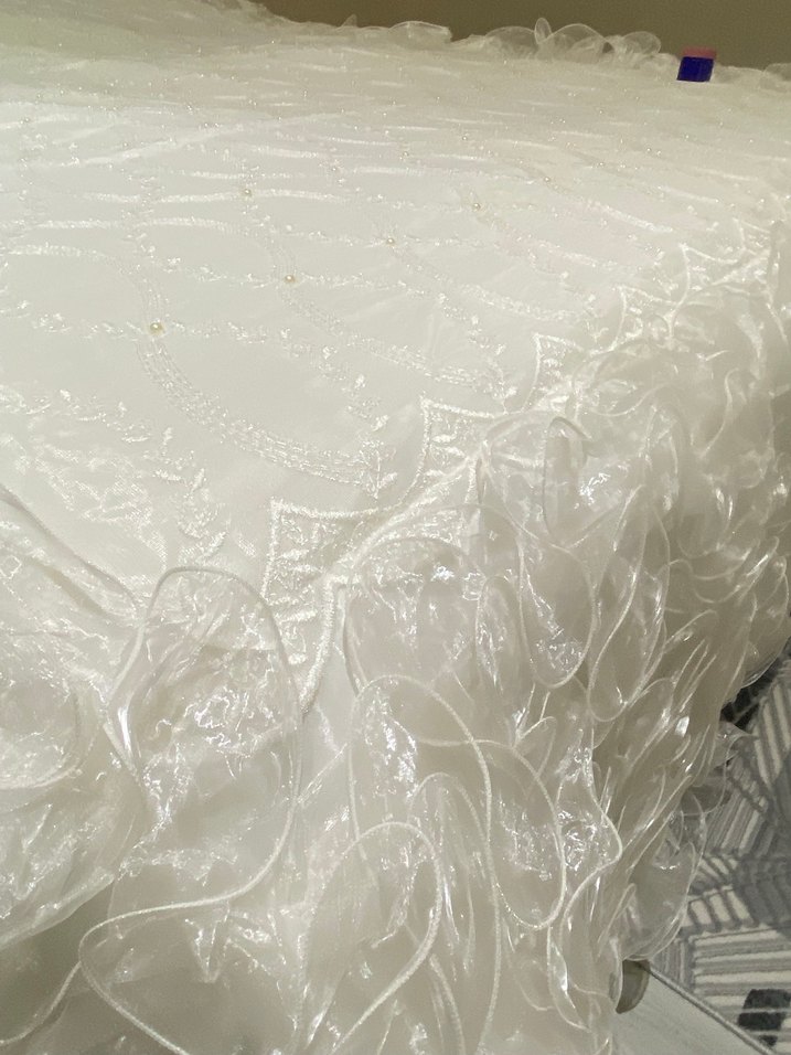 Parlak kumaşlı, işlemeli desenlere sahip beyaz yatak örtüsü, kenarında dekoratif fırfır detayları bulunur. ️sıfır ürün