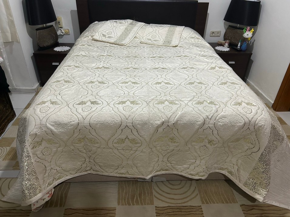 İşlemeli desenlere sahip beyaz ve parlak yatak örtüsü, yatak odasına şıklık katıyor. Uyuyan kılıfları ile birlikte.kadife kumaştır sıfır ürün