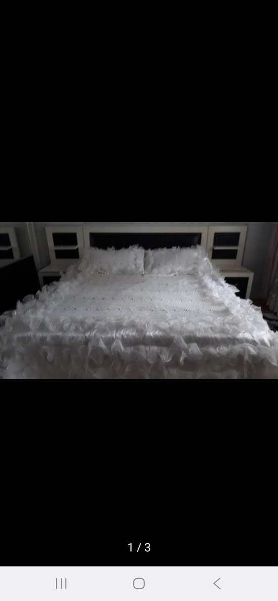 İşlemeli detaylara ve dekoratif volanlı kenarlara sahip parlak beyaz yatak örtüsü. Yatak odasına zarif bir dokunuş katar. ️