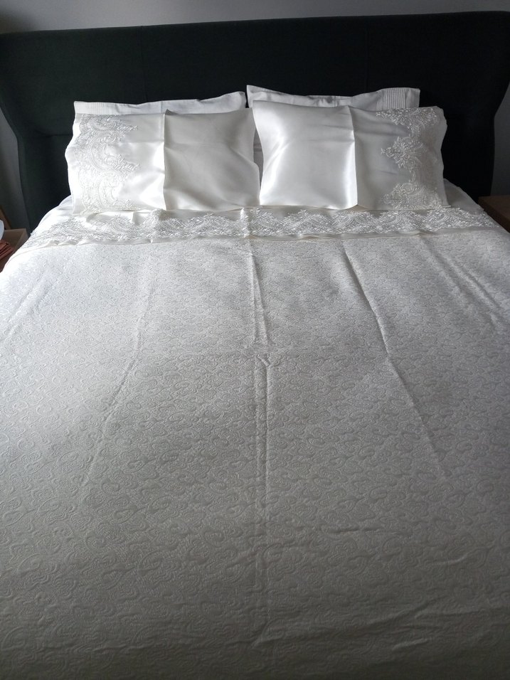 Parlak yüzeyli ve işlemeli desenlere sahip beyaz yatak örtüsü, yatak odasına zarif bir dokunuş katıyor. ✨ Hiç kullanılmadı, sadece paketinden çıkarıldı.