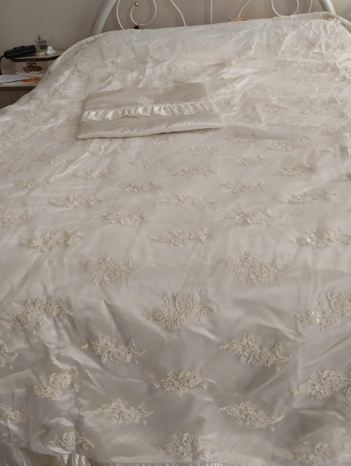 İşlemeli Beyaz Parlak Yatak Örtüsü