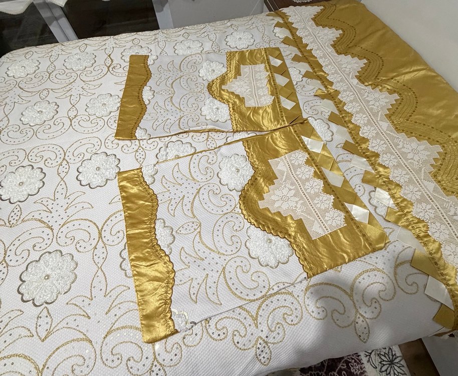 Parlak altın detaylar ve ince işlemeli desenlere sahip beyaz yatak örtüsü, odanıza zarafet katıyor. ✨