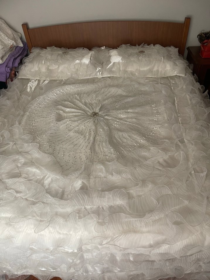 İşlemeli detaylara ve dekoratif fırfırlara sahip parlak beyaz yatak örtüsü, yatak odasına zarif bir dokunuş katıyor. ️