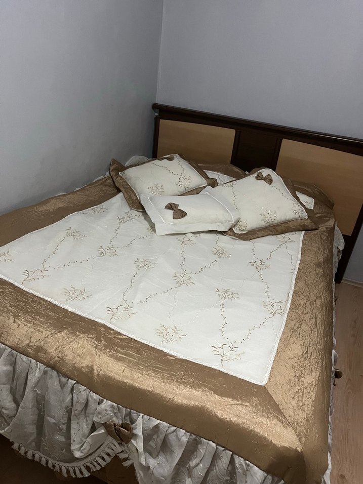 İşlemeli desenli, parlak beyaz kumaştan yapılmış yatak örtüsü, yumuşak kahverengi kenarlıklarla çevrilidir. Fiyonk detaylı uyumlu dekoratif yastıklar içerir. ️