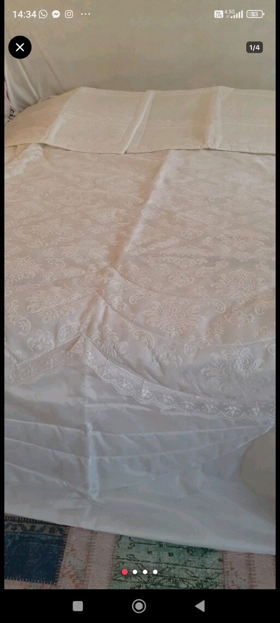 Parlak yüzeye sahip beyaz yatak örtüsü, zarif işlemeli desenlerle süslenmiştir. ️ marka temsilidir.