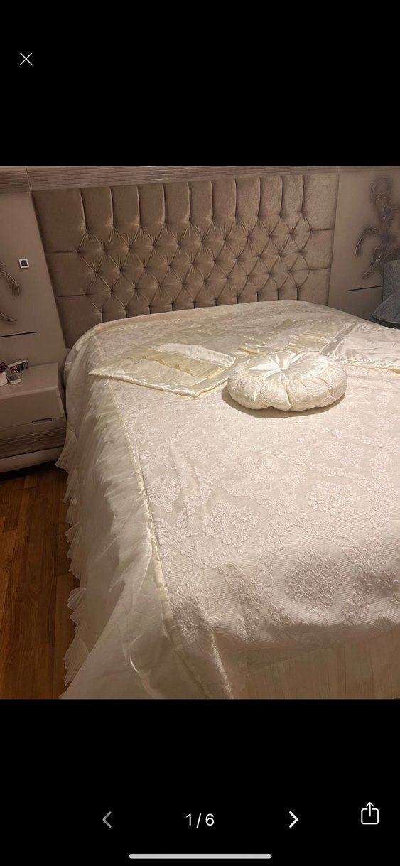 İşlemeli desenli, parlak beyaz kumaştan yatak örtüsü. Üzerinde uyumlu dekoratif yastıklar bulunur. ️