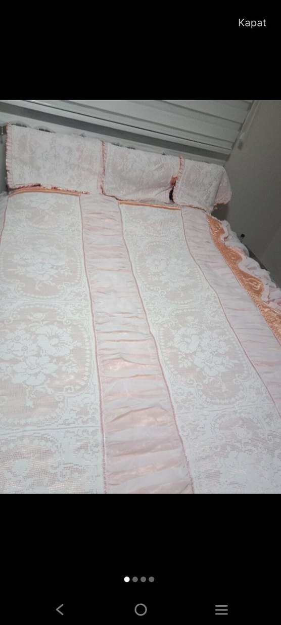 İşlemeli beyaz çiçek desenli yatak örtüsü, pastel detaylar ve uyumlu yastık kılıfları ile. Yumuşak ve şık tasarım, yatak odasına zarafet katar. ️