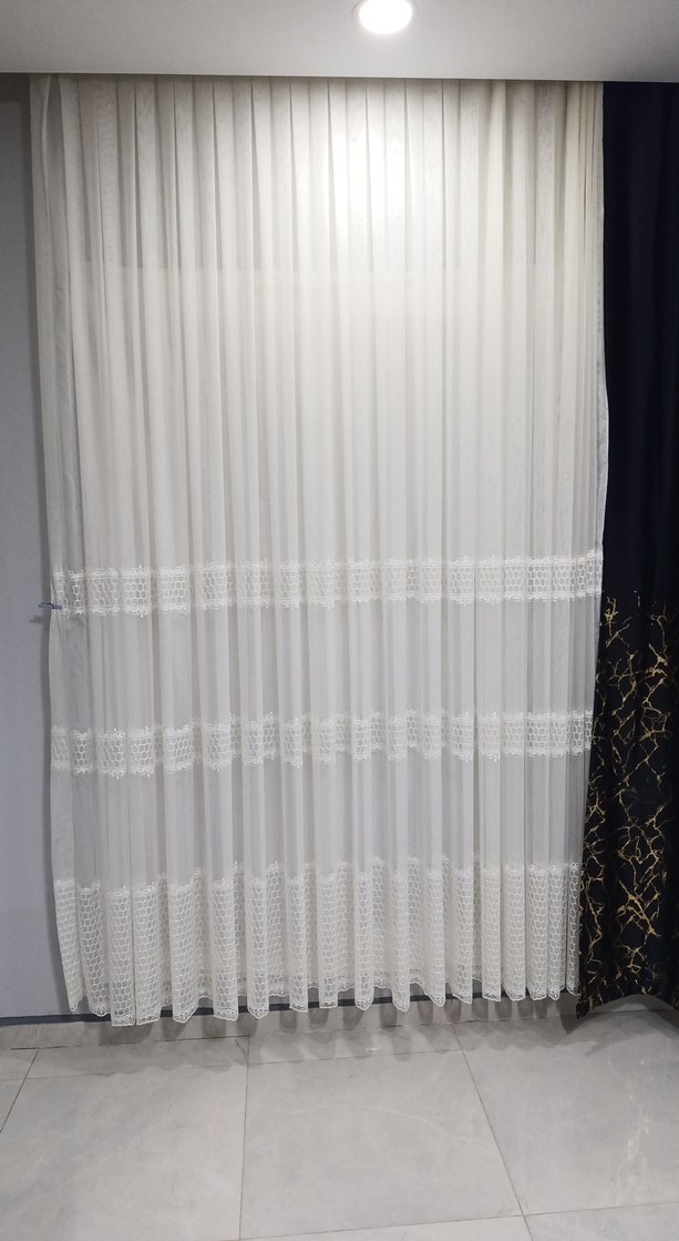 İşlemeli desenlere sahip beyaz perde, klasik tasarım ve zarif detaylar sunar. Pencereleriniz için hafif ve şık bir görünüm sağlar.