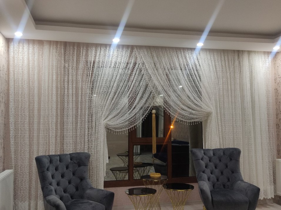 Hafif ve işlemeli beyaz klasik perde, odaya zarif bir dokunuş katar.4.50 genişlik.2.65 uzunluk