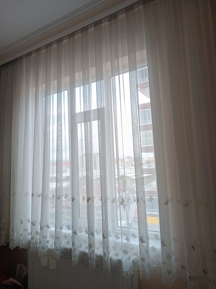 Uçları işlemeli, hafif beyaz renkte klasik ve zarif perde. brillant marka pencereye kisilmadan dolayı defo olmuş fiyatı uygun tutuyorum almak isteyene yardımcı olurum eni uzunu 210 eni 240