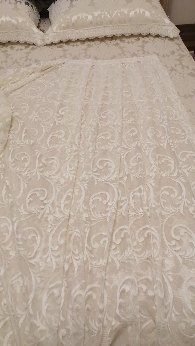 İşlemeli çiçek desenli beyaz perde, hafif ve klasik tarzda. Her odaya zarif bir dokunuş Katar.