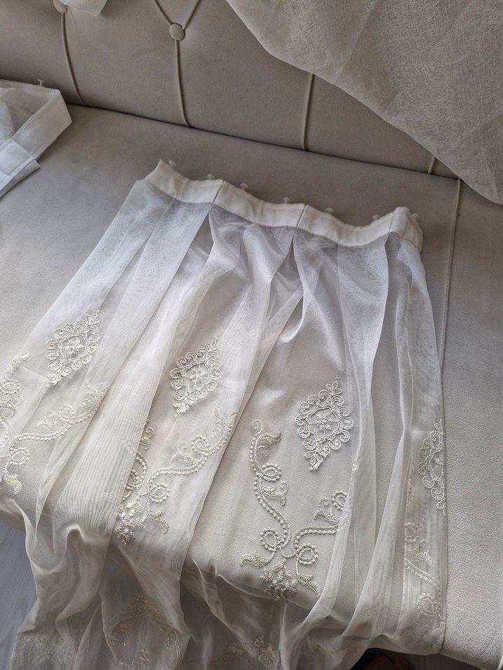 Hafif beyaz tonda, işlemeli desenlere sahip, klasik tarzda ince kumaştan perde. Zarif dekoratif bir dokunuş sağlar. eni 47 bir kenarı dikilmemis