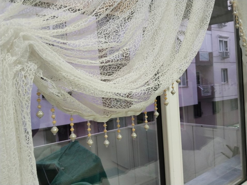 İşlemeli desenli, boncuklu kenarlarıyla hafif ve zarif beyaz klasik perde. en 200 boy 250