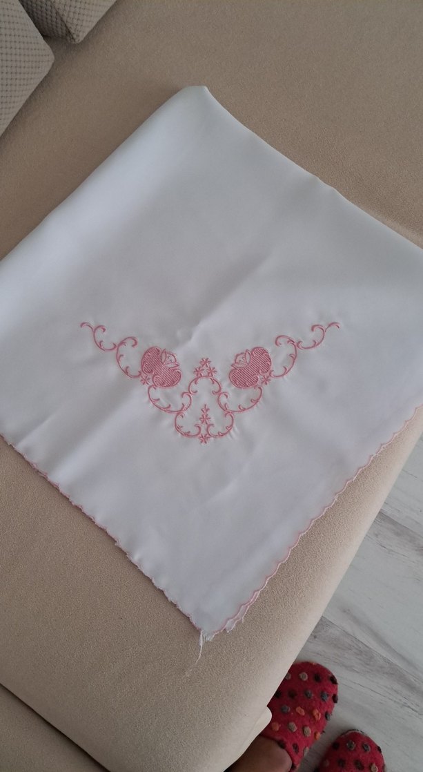 Beyaz masa örtüsünde pastel pembe işlemeler ve dalgalı kenar detayı bulunur.