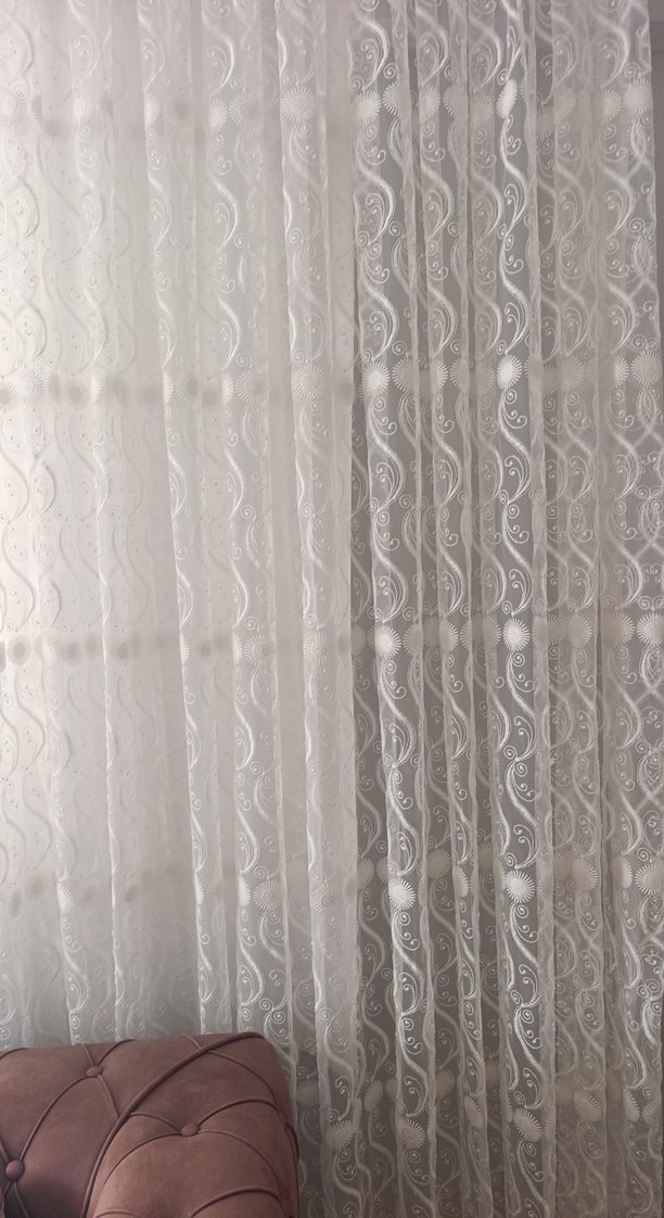 İşlemeli desenlere sahip beyaz tül perde, klasik tarzda ve hafif gri tonlarla. Her odaya şıklık ve hafif ışık geçirgenliği sağlar. 3 buçuk eni elimde iki adet var tane fiyatı