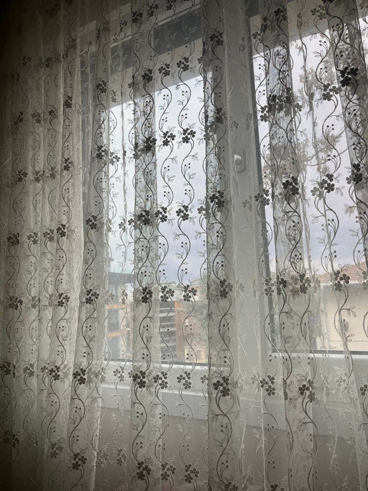 İnce işlemeli çiçek desenleri ve dantelli kenarlarıyla beyaz tül perde, hafif ve zarif bir görünüm sunar. En 3 m boy 165