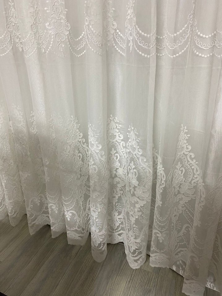 İşlemeli desenlere sahip beyaz tül perde, hafif ve klasik bir tarz sunar. Şeffaf kumaşıyla odanıza zarif bir dokunuş katar. eni 3 metre boy2'55 yıka as kirşmaz