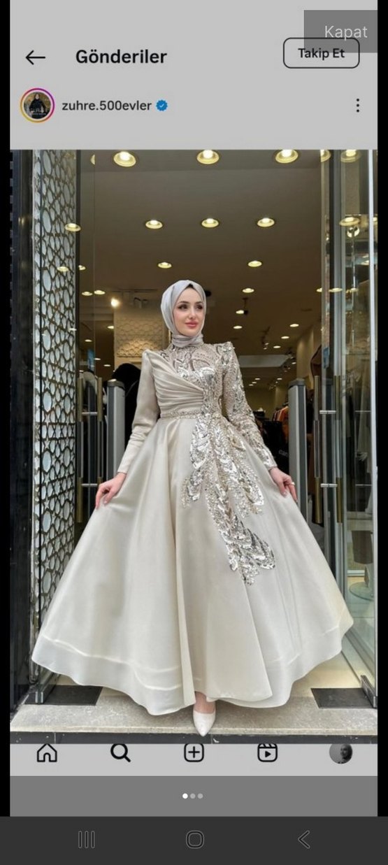 (((*Sadece bir kere nişanında giydim*))) İşlemeli desenlere ve drapeli tasarıma sahip beyaz uzun abiye elbise. Straplez yaka ve uzun kollu, düzenli kesim, düğünler için uygun bir model. ✨