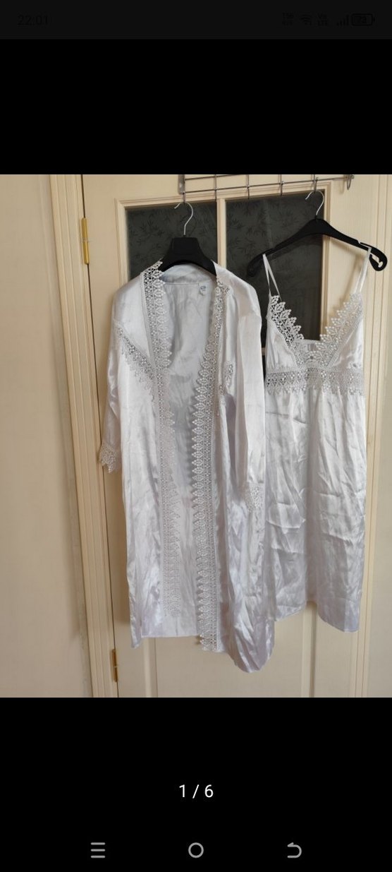 İşlemeli detaylara sahip, parlak kumaştan yapılmış, uzun ve bol kesim beyaz bohem tarzda kadın pijama takımı, kolsuz model.