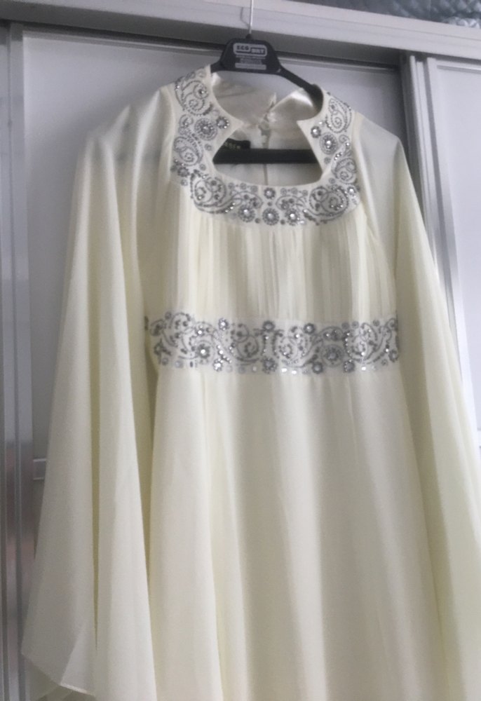 İşlemeli detaylara sahip, tekne yaka, kolsuz ve bol kesim beyaz uzun abiye elbise. Vintage düğünler için uygun klasik şıklıkta.