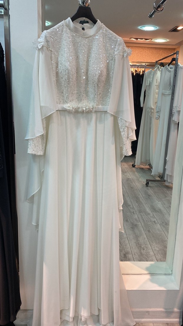 İşlemeli straplez üst kısmı, uzun kollu ve dökümlü bol kesim eteğiyle beyaz nişan elbisesi. Klasik şıklığı yansıtır.