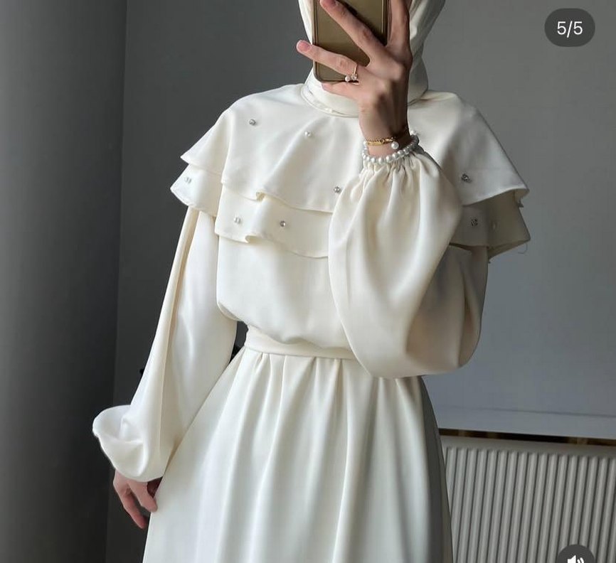 Yüksek yakalı, bol kesim ve işlemeli katmanlı beyaz uzun elbise. İpeksi kumaştan, günlük kullanım için çağdaş minimalist şıklık sunar.