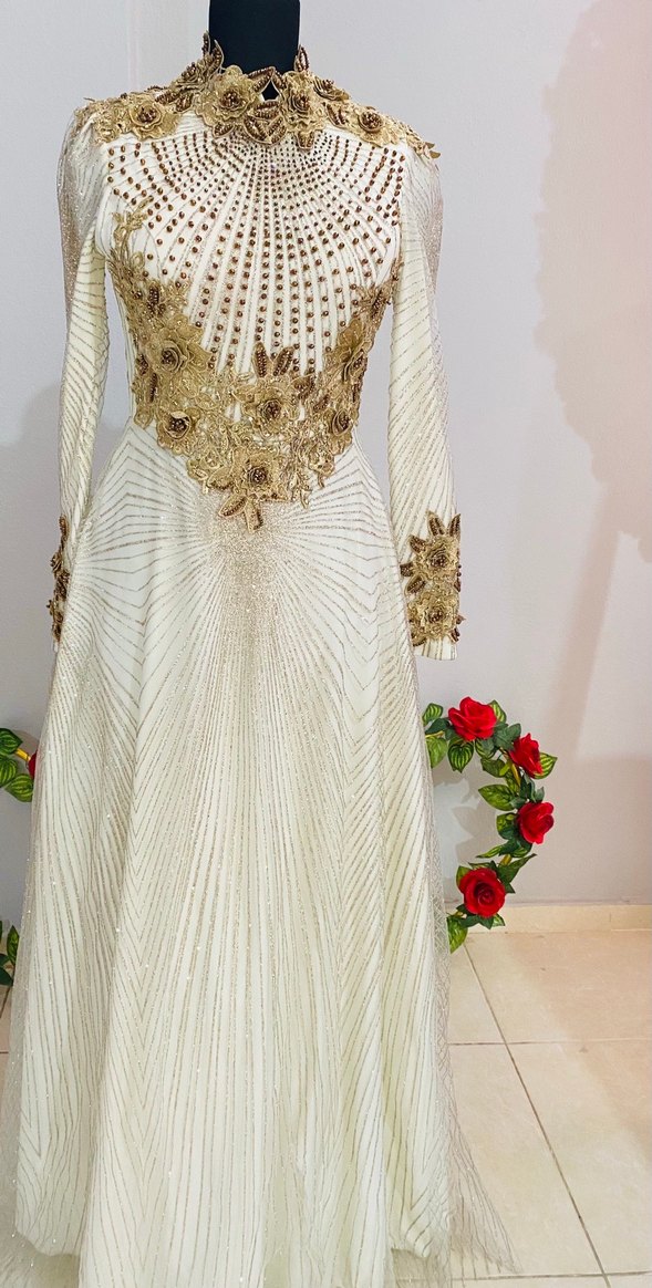 İşlemeli detaylara sahip, V yakalı ve uzun kollu beyaz uzun abiye. Düzenli kesim ve drapeli tasarım, klasik şıklık sunar. ✨