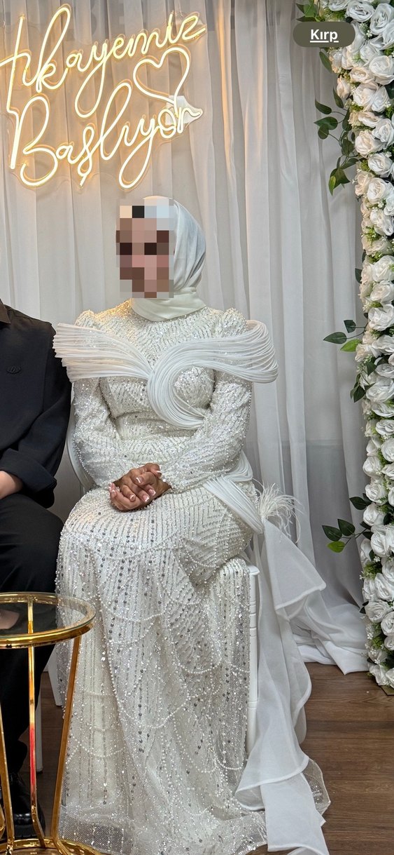 İşlemeli detaylara sahip, yüksek yakalı, drapeli ve askılı kolları olan beyaz, uzun ve dar kesim nişan elbisesi. Mütevazı ve avangart tarzda. 1 kere giyinildi 38 40 beden uygundur