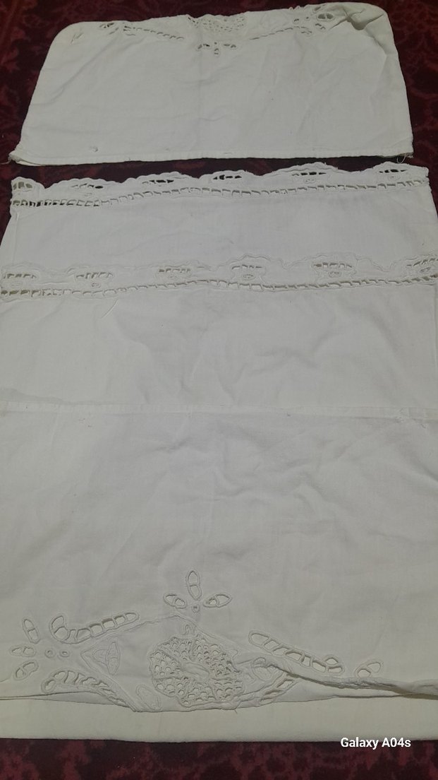 İşlemeli ve dantel detaylı beyaz makina işi takımı, hafif ve şık bir görünüm sunar. ️uzun yastik ve tepesi ile birlikde defolari mevcut nakişinda sorun yok