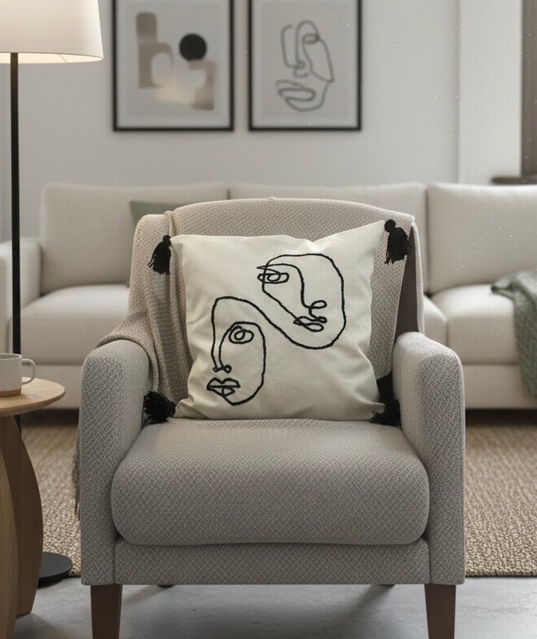 Köşelerinde siyah püsküller bulunan beyaz kılıf üzerinde gri işlemeli soyut yüz desenleri ile modern bir dekoratif kırlent.