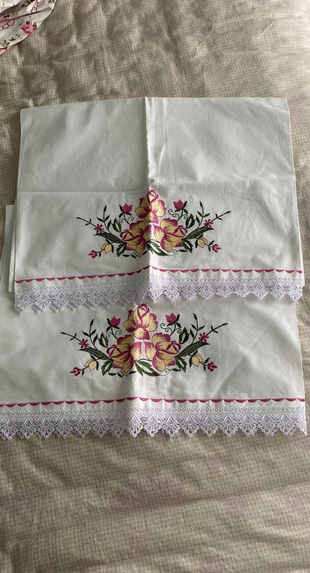 Pembe ve sarı çiçek işlemeleri ile dantel kenarlıklı beyaz yastık kılıfı Hafif ve klasik tarzda.