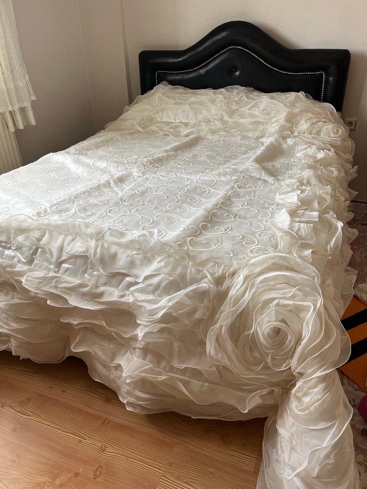 İşlemeli desenlere ve fırfırlı kenarlara sahip beyaz yatak örtüsü, yatak odanıza zarif bir dokunuş katar.