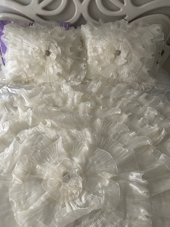 İşlemeli desenlere ve zarif fırfırlara sahip beyaz yatak örtüsü, yatak odasına şık bir dokunuş katar.