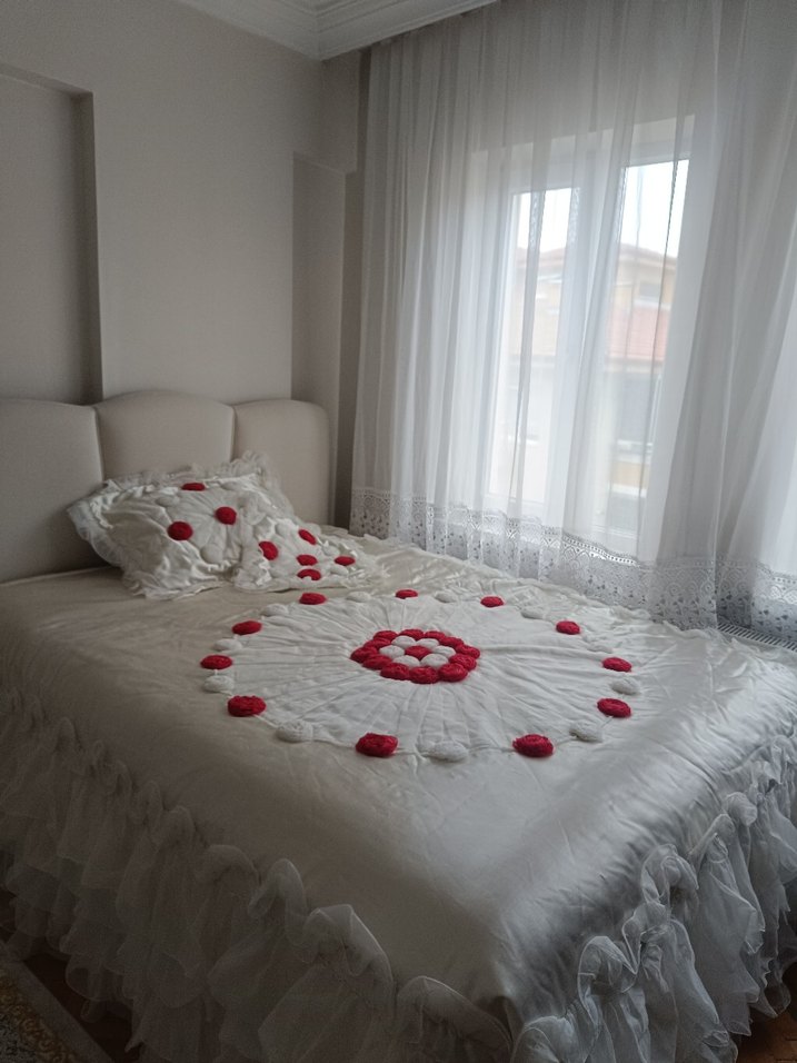 İşlemeli çiçek desenleri ve fırfırlı kenarlarıyla beyaz yatak örtüsü, odaya zarif bir dokunuş katıyor. bazı yerlerinde problem var belirttim fotoğraf da o yüzden uygun koydum ona göre alın