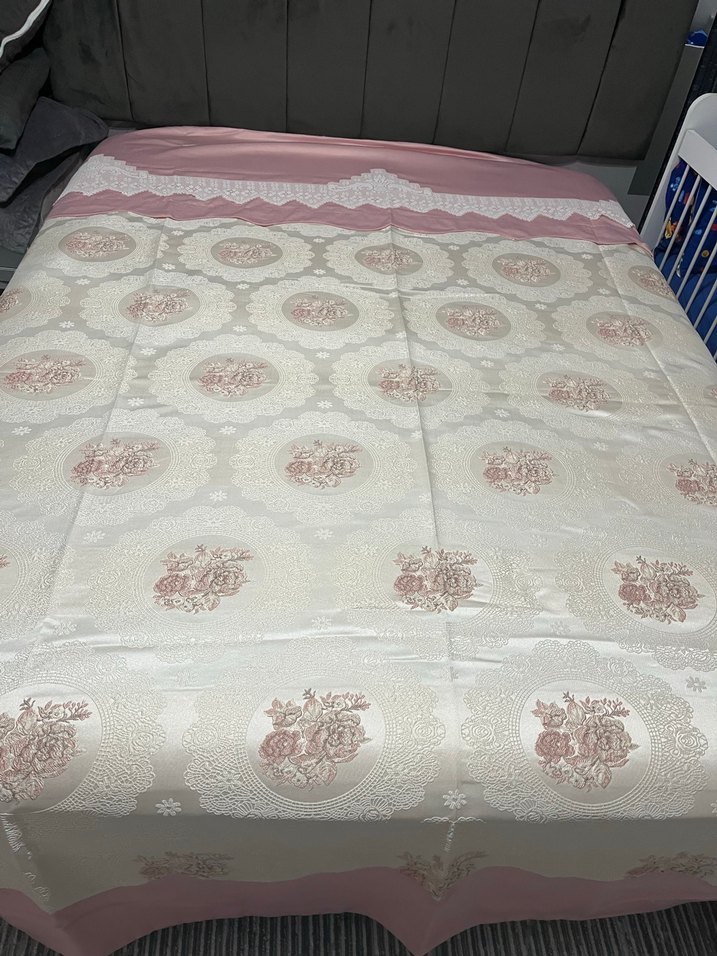 İşlemeli çiçek desenlerine ve yumuşak pembe kenarlığa sahip beyaz yatak örtüsüdür. Sıfır üründür baya büyüktür çeyiz için yapılmıştır 4 yastık bir çarşaf birde pikeden oluşulmuştur