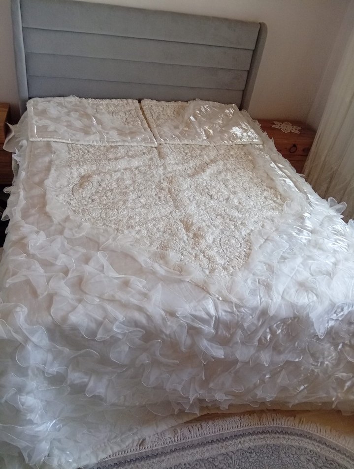 İnce işlemeli desenlere ve kat kat fırfırlara sahip beyaz yatak örtüsü, yatak odasına yumuşak ve zarif bir dokunuş katıyor. ️