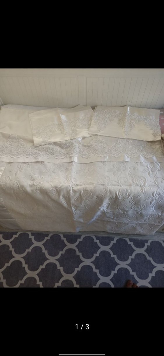 İşlemeli desenlere sahip beyaz yatak örtüsü, yumuşak ve şık bir dokuya sahiptir. Detaylı işlemeli uyumlu yastık kılıfları içerir. ️