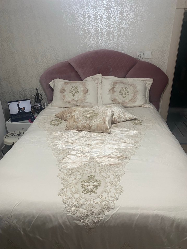 İşlemeli desenlere sahip beyaz yatak örtüsü, yumuşak ve zarif detaylarla şık bir görünüm sunar. ️