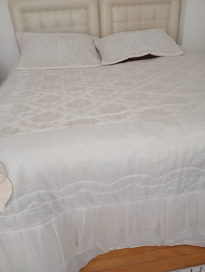 İnce işlemeli desenlere sahip beyaz yatak örtüsü, yumuşak ve hafif dokusuyla yatak odasına zarif bir dokunuş katıyor. Yastık kılıfları da dahildir. ️