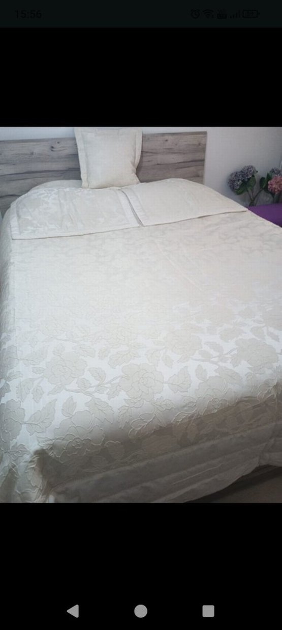 İnce işlemeli çiçek desenlerine sahip beyaz yatak örtüsü, yatağa zarif bir doku ve şıklık katıyor. Açık renk odanın aydınlığını artırır. ️