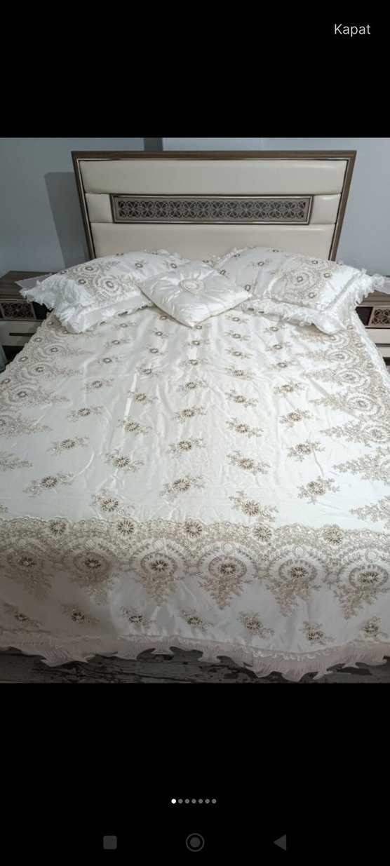 İşlemeli desenlere sahip beyaz yatak örtüsü ve uyumlu dekoratif yastıklar. Hafif ve zarif tasarım, yatak odasına şıklık katıyor. ️