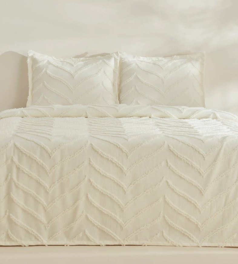 İnce işlemeli desenlere sahip beyaz yatak örtüsü, yatak odanıza zarif bir dokunuş katıyor. Uyumu sağlayan yastık kılıfları ile birlikte gelir. ️