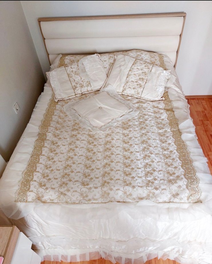 İnce işlemeli ve zarif dantel kenarlıklı beyaz yatak örtüsü seti, yatak odasına yumuşak ve şık bir dokunuş katar.Evkur dan alınmıştı hiç kullanılmadı