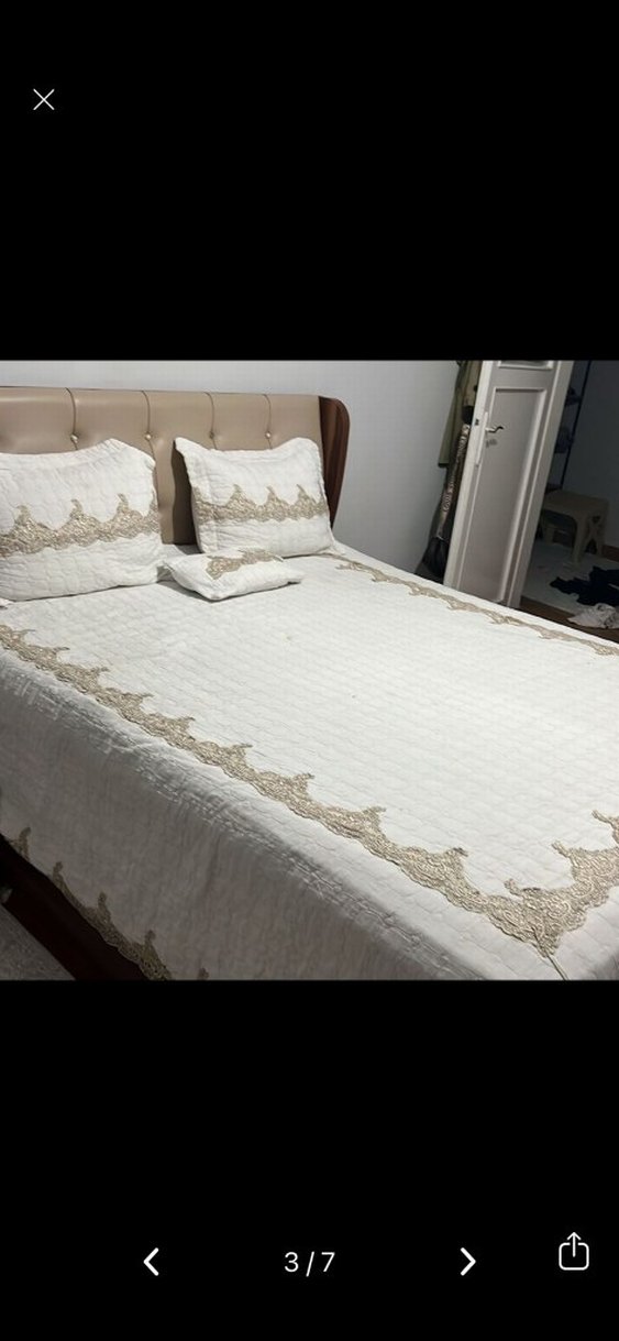 Kenarlarında işlemeli desenler bulunan beyaz yatak örtüsü seti, uyumlu yastık kılıfları ile birlikte. Hafif ve şık tasarım. ️