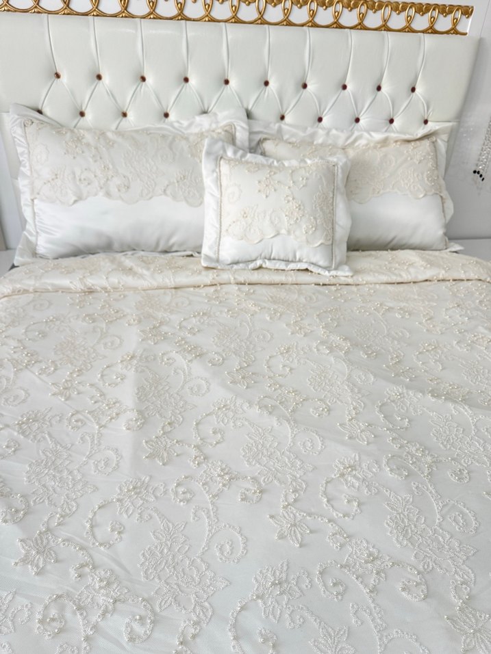 İşlemeli Beyaz Yatak Örtüsü Seti