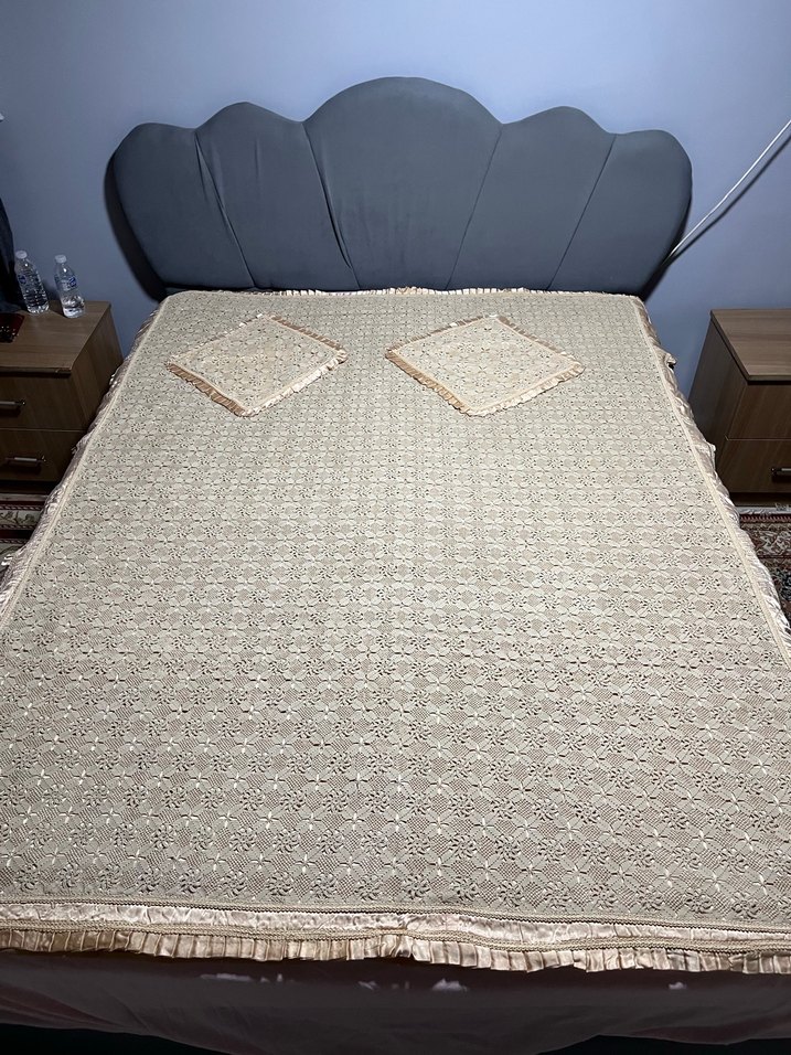 İşlemeli beyaz yatak örtüsü, yanında uyumlu kırlentlerle birlikte gelir. İnce desenleriyle yatağa zarif bir doku katar. El emeğidir 1 2 kere kullanılmıştır serili olduğu yatak en 1.50 boy 2 metredir kırlentler sete dahildir beraber tertemiz şekilde gönderilecektir