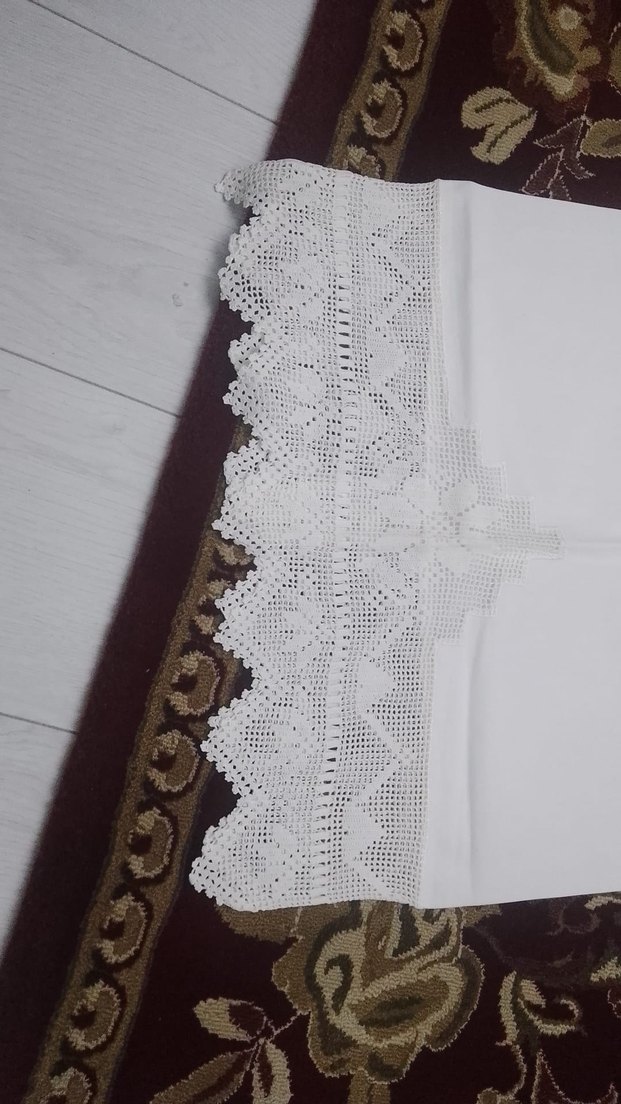 Parlak beyaz kumaştan yapılmış, kenarları işlemeli klasik tarzda masa örtüsü. ✨