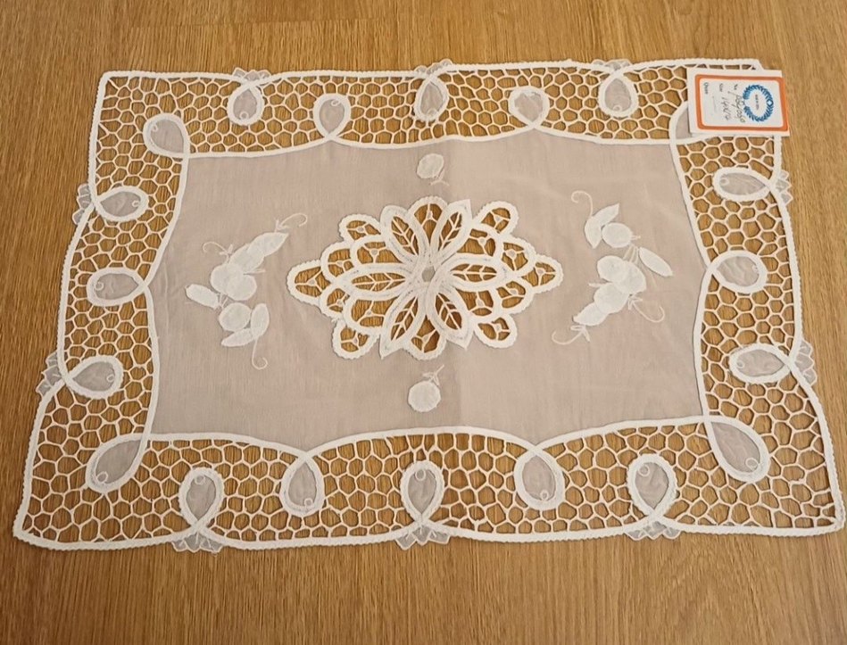 Organze kumaş üzerine tamamen el yapımı meyve nakışlı Brüksel dantelli kusursuz yepyeni 6 parça 32x46 cm ebat. İşçilik mükemmel ve tertemiz, çalışılmış #yeni #organze #rahibeişi #çeyiz #beyaziş #elişi #ithal #etiketli #çeyiz #rahibeişi #aplike #sarmanakış #masaörtüsü #Brükseldanteli #orjinal #dantelanglez #rokoko #vintageBeyaz renkli, işlemeli bohem desenlere sahip masa örtüsü. İnce dantel detayları ve çiçek motifleriyle zarif bir görünüm sunar.