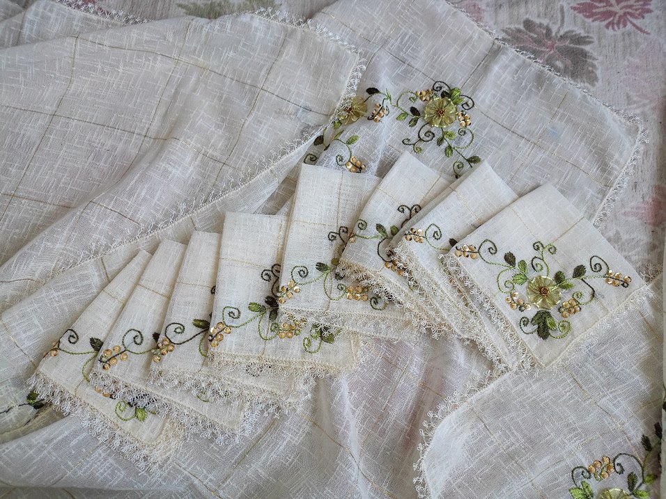 Takımda 8 adet küçük kare örtü (sehpa) 1 orta boyutta kare örtü 1 büyük kare örtü 1 dikdörtgen orta boyut örtü bulunmaktadır Bazı yerlerinde defosu vardır yırtık olarak değil küçük kahverengi leke beklemekten olmuş.