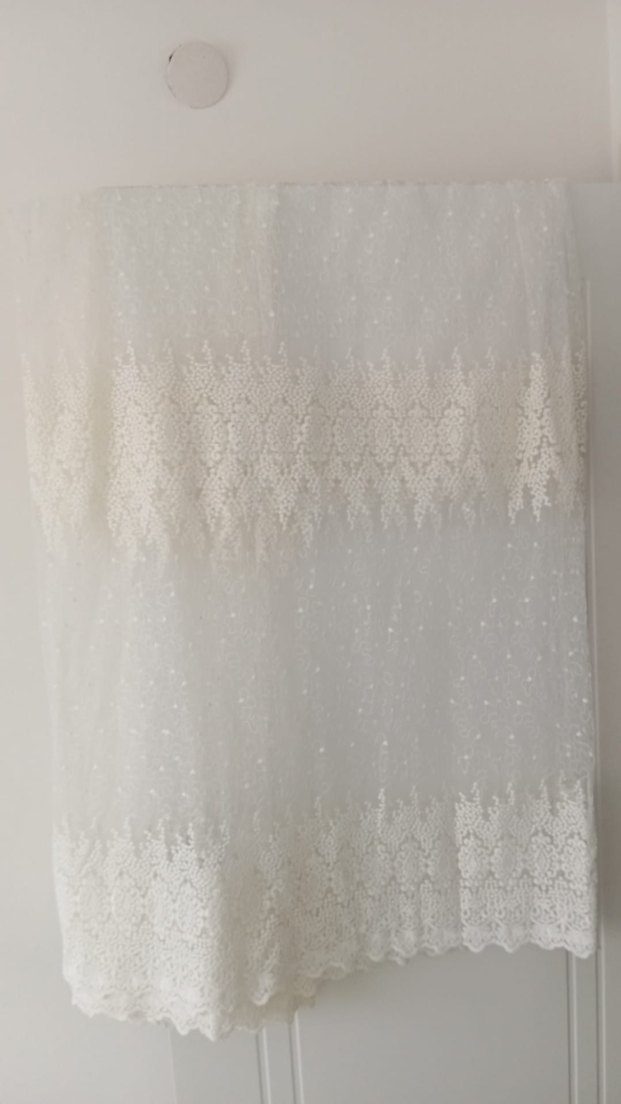İşlemeli desenlere sahip, bohem tarzda hafif beyaz tül perde. Odaya zarif ve hafif bir hava katıyor. eni 3 metre boyu 2,60santem. pile siz 1-2 kez kullanmış yeni tacın markası ürün temiz